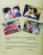 /i A brother shares childhood memories and grown up dreams. ~Author Unknown A brother is a friend given by Nature. ~Jean Baptiste Legouve Sometimes being a brother is even better than being a superhero. ~Marc Brown iom