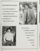 JOHN-FRANCIS MUSIAL THANK YOU FOR BEING A VERY SPECIAL YOUNG MAN. WHO HAS THE TALENT, AMBITION AND POTENTIAL TO BE GREAT AT WHAT EVER YOU DO. YOU MAKE ME EXTREMELY PROUD. MAY YOU HAVE LOTS OF LUCK AND HAPPINESS. LOVE DAD 183