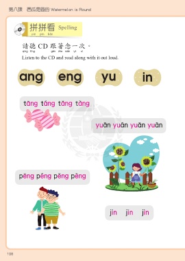 第八課 西瓜是圓的 Watermelon is Round 拼拼看 Spelling 拼拼看 請聽 CD 跟著念一次。 請聽 跟著念一次 Listen to the CD and read along with it out loud. ang eng yu in 108