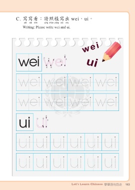 C. 寫寫看:請照樣寫出 wei、ui。 寫寫看 請照樣寫出 Writing: Please write wei and ui. wei wei ui ui Let's Learn Chinese 學華語向前走 163
