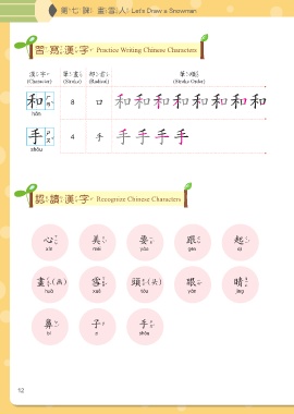 第七課 畫雪人 Let's Draw a Snowman 習寫漢字 Practice Writing Chinese Characters 漢字 筆畫 部首 筆順 (Character) (Stroke) (Radical) (Stroke Order) 和 8 口 和 手 4 手 手 認讀漢字 Recognize Chinese Characters 心 美 要 跟 起 心 美 要 跟 起 畫(畫) 雪 頭(頭) 眼 睛 畫 雪 頭 眼 睛 鼻 子 手 鼻 子 手 12