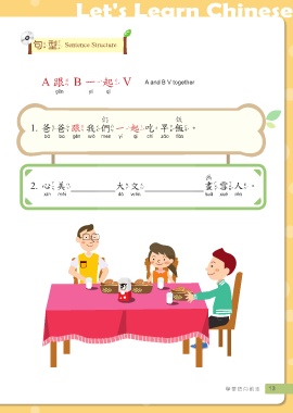 Let's Learn Chinese 句型 Sentence Structure A 跟 B 一起 V A and B V together 跟 一 起 們 飯 1. 爸爸跟我們一起吃早飯。 爸爸跟我們一起吃早飯 畫 2. 心美 大文 畫雪人。 心美 大文 畫雪人 學華語向前走 13