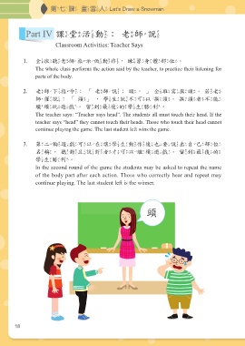 2. 老師下指令:「老師說:頭。」全班需摸頭。若老