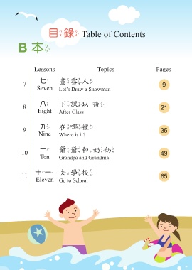 目錄 Table of Contents B 本 Lessons Topics Pages 7 七 畫雪人 9 Seven Let’s Draw a Snowman 8 八 下課以後 21 Eight After Class 9 九 在哪裡 35 Nine Where is it? 10 十 爺爺和奶奶 49 Ten Grandpa and Grandma 11 十一 去學校 65 Eleven Go to School