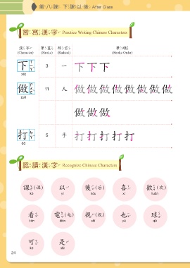 第八課 下課以後 After Class 習寫漢字 Practice Writing Chinese Characters 漢字 筆畫 部首 筆順 (Character) (Stroke) (Radical) (Stroke Order) 下 3 一 下 做 11 人 做 打 5 手 打 認讀漢字 Recognize Chinese Characters 課(課) 以 後(后) 喜 歡(歡) 課 以 後 喜 歡 看 電(電) 視(視) 也 球 看 電 視 也 球 可 是 可 是 24