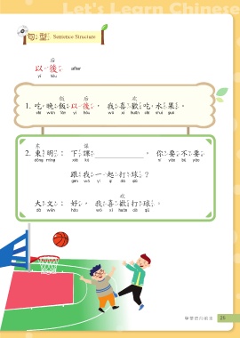 Let's Learn Chinese 句型 Sentence Structure 后 以後 after 以後 飯 后 歡 1. 吃晚飯以後,我喜歡吃水果。 吃晚飯以後 我喜歡吃水果 東 課 2. 東明: 下課 ,你要不要 東明 下課 你要不要 跟我一起打球? 跟我一起打球 歡 大文:好,我喜歡打球。 大文 好 我喜歡打球 學華語向前走 25