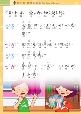 第十課 爺爺和奶奶 Grandpa and Grandma 第十課 爺爺和奶奶 第十課 爺 爺 和 奶 奶 這 張 大文: 這張照片上面的人是 大文 這張照片上面的人是 誰 誰? 誰 們 爺 爺 心美:他們是我爺爺和奶奶。 心美 他們是我爺爺和奶奶 們 幾 歲 大文:他們幾歲? 大文 他們幾歲 爺 爺 歲 心美: 爺爺七十歲,奶奶六 心美 爺 爺 七十歲 奶 奶 六 歲 十五歲。 十五歲 52
