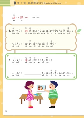 第十課 爺爺和奶奶 Grandpa and Grandma 這 這 / 那… this / that 這 那 東 這張 誰 1. 東明:這張照片上面的女生是誰? 東明 這張照片上面的女生是誰 們 學 心美:她們是我的同學。 心美 她們是我的同學 這兩個 誰 2. 大文:這兩個人是誰? 大文 這兩個人是誰 爺爺 心美: 是我爺爺和奶奶。 心美 是我爺爺和奶奶 58