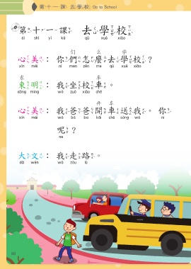 第十一課 去學校 Go to School 第十一課 去學校 第十一課 去 學 校 們 么 學 心美:你們怎麼去學校? 心美 你們怎麼去學校 東 車 東明:我坐校車。 東明 我坐校車 開 車 心美: 我爸爸開車送我。你 心美 我爸爸開車送我 你 呢? 呢 大文:我走路。 大文 我走路 66