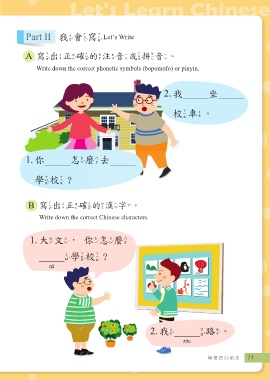 Let's Learn Chinese Part II 我會寫 Let’s Write A 寫出正確的注音或拼音。 Write down the correct phonetic symbols (bopomofo) or pinyin. 2. 我 坐 校車。 1. 你 怎麼去 學校? B 寫出正確的漢字。 Write down the correct Chinese characters. 1. 大文,你怎麼 去學校? 去 2. 我 走 路。 走 學華語向前走 71