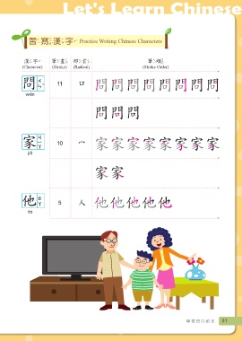 Let's Learn Chinese 習寫漢字 Practice Writing Chinese Characters 漢字 筆畫 部首 筆順 (Character) (Stroke) (Radical) (Stroke Order) 問 11 口 問 家 10 宀 家 他 5 人 他 學華語向前走 81