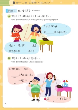 第十二課 在家嗎 Are You Home? Part II 我會寫 Let’s Write A 寫出正確的注音或拼音。 Write down the correct phonetic symbols (bopomofo) or pinyin. 2. 他不在 , 他 在學校。 1. 喂為,請問 東 明在家 嗎? B 寫出正確的漢字。 Write down the correct Chinese characters. 1. 你好,請 問大文在 問 家嗎? 家 2. 他不在。 他 86
