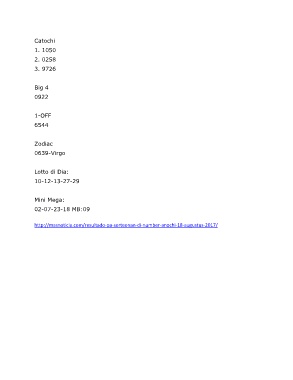 Catochi 1. 1050 2. 0258 3. 9726 Big 4 0922 1-OFF 6544 Zodiac 0639-Virgo Lotto di Dia: 10-12-13-27-29 Mini Mega: 02-07-23-18 MB:09 http://masnoticia.com/resultado-pa-sorteonan-di-number-anochi-18-augustus-2017/