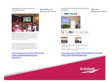 Arubanative.com Diario.aw PR Cost in Afl. 172,50 PR Cost in Afl. 172,50 https://arubanative.com/2017/09/15/aruba http://www.diario.aw/2017/09/empleadonan-di-aruba- -bank-a-sostene-simposio-di-good- bank-a-ricibi-charla-di-prevencion/ governance/