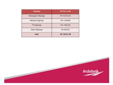 Clippings PR Cost in Afl. Newspaper Clippings Afl. 45.411,45 Website Clippings Afl. 4.140,00 TV Clippings Afl. 7.831,40 Radio Clippings Afl. 634,45 Total Afl. 58.017,30