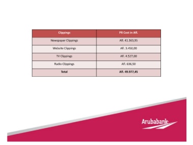 Clippings PR Cost in Afl. Newspaper Clippings Afl. 41.363,95 Website Clippings Afl. 3.450,00 TV Clippings Afl. 4.527,00 Radio Clippings Afl. 636,50 Total Afl. 49.977,45