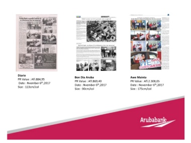 Diario Bon Dia Aruba Awe Mainta PR Value : Afl.884,95 PR Value : Afl.869,40 PR Value : Afl.2.308,05 th Date : Nvember 6 ,2017 Date : Nvember 6 ,2017 Date : November 6 ,2017 th th Size : 113cm/col Size : 90cm/col Size : 175cm/col