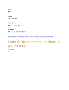 1Off 3206 Zodiac 0873- Acuario Lotto di Dia 03 – 04 – 06 – 13 – 18 Minimega 18- 19- 22- 28 Megaball: 03 http://masnoticia.com/resultado-di-sorteo-di-number-anochi-20-october-2017/ Lotto di Dia a entrega un check di Afl. 73.000,- 20 October, 2017 0