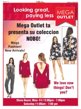 Pagina 16 Diamars 21 Maart 2017 Mega Outlet ta presenta su coleccion NOBO! Mega Fashion! New Arrivals! We love new things! Don’t you? Store Hours: Mon- Fri 12:00pm - 7:00pm Saturday 11:00am - 7:00 pm
