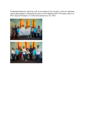 Comunidad henter pa aporta pa yuda di un manera of otro pa haci e soño di e atletanan special aki participa y representa nos pais na Abu Dhabi na 2019! Por tuma contact cu SOA (Special Olympics of Aruba) directamente na 522-7842.