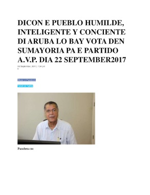 DICON E PUEBLO HUMILDE, INTELIGENTE Y CONCIENTE DI ARUBA LO BAY VOTA DEN SUMAYORIA PA E PARTIDO A.V.P. DIA 22 SEPTEMBER2017 20 September, 2017, 7:34 pm 0 0 Share on Facebook Tweet on Twitter Pasobra cu: