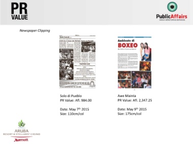 Newspaper Clipping Solo di Pueblo Awe Mainta PR Value: Afl. 984.00 PR Value: Afl. 2,347.25 Date: May 7th 2015 Date: May 9th 2015 Size: 110cm/col Size: 175cm/col