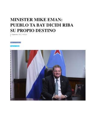 MINISTER MIKE EMAN: PUEBLO TA BAY DICIDI RIBA SU PROPIO DESTINO 21 September, 2017, 10:29 pm 0 14 Share on Facebook Tweet on Twitter