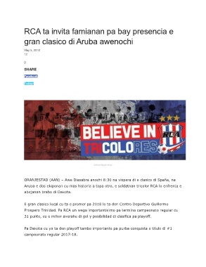 Aruba e dos ekiponan cu mas historia a topa otro, e soldatnan tricolor RCA lo enfrenta e