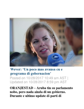 Wever: ‘Un poco mas avansa cu e programa di gobernacion’ Posted on 10/28/2017 10:49 am AST | Updated on 10/28/2017 8:59 pm AST ORANJESTAD – Aruba tin su parlamento nobo, pero nada ainda di un gobierno. Durante e ultimo update di parti di
