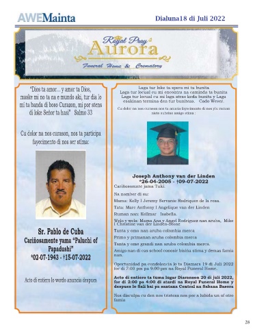 Oportunidad pa condolencia lo ta Diamars 19 di Juli 2022