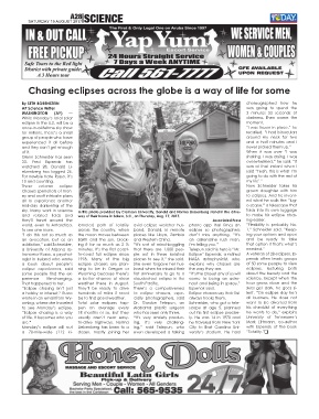 a hobby or interest,” Russo hundreds of miles if need to eclipse chasers, espe- Eclipse chasers say their first lent. “On eclipse day he’s