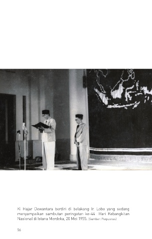 Ki Hajar Dewantara berdiri di belakang Ir. Lobo yang sedang menyampaikan sambutan peringatan ke-44 Hari Kebangkitan Nasional di Istana Merdeka, 20 Mei 1955. (Sumber: Perpusnas) 56