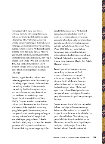 di bagian akhir teks, juga didukung oleh Melayu. Sedikitnya karangan Abdurrauf sesuai dengan pengetahuan doktrin pernah belajar ilmu-ilmu keislaman di