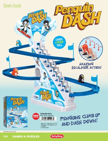 OVER 1 FOOT TALL PENGUIN RACE PLG • $7.50 • 6 pc min • Ages: 3+ • Pkg. Size: 12.5” H • Requires 3 AA batteries, not included • On/Off switch *Actual products may vary from photos. 118 GAMES & PUZZLES