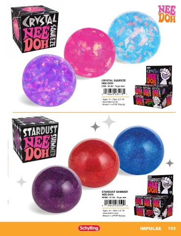CRYSTAL SQUEEZE NEE-DOH CSB • $1.50 • 12 pc min • Ages: 3+ • Size: 2.5” W • Assorted Colors • Boxed in a POP Display STARDUST SHIMMER NEE-DOH SDSB • $1.50 • 12 pc min • Ages: 3+ • Size: 2.5” W • Assorted Colors • Boxed in a POP Display IMPULSE 133