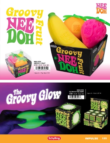 NEE-DOH GROOVY FRUIT GFND • $3.00 • 12 pc min • Ages: 3+ • Pkg. Size: 3” W NEE-DOH GLOW IN THE DARK • Ages: 3+ • Size: 2.25” W GND • $1.50 • 12 pc min IMPULSE 135