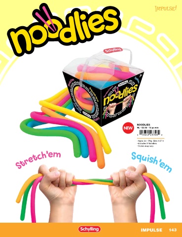 NOODLIES NL • $2.50 • 12 pc min • Ages: 3+ • Pkg. Size: 2.5” H • Includes 5 Noodlies • Colors may vary IMPULSE 143