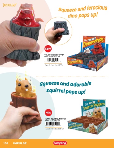 VOLCANIC DINO POPPER DPOP • $2.00 • 12 pc min • Ages: 3+ • Item Size: 2.25” Tall NUTTY SQUIRREL POPPER SPOP • $2.00 • 12 pc min • Ages: 3+ • Item Size: 2.25” Tall 158 IMPULSE