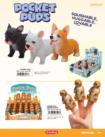 POCKET PUPS PPUP • $1.75 • 24 pc min • Ages: 3+ • POP Size: 10.5” W • 24 assorted pcs in a POP PRAIRIE DOG FINGER PUPPET PDFP • $1.00 • 24 pc min • Ages: 3+ • Item Size: 2.5” Tall • 24 pcs in a POP IMPULSE 161