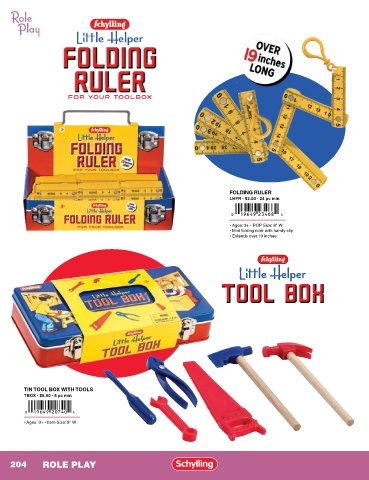 FOLDING RULER LHFR • $2.00 • 24 pc min • Ages: 3+ • POP Size: 8" W • Mini folding ruler with handy clip • Extends over 19 inches TIN TOOL BOX WITH TOOLS TBOX • $6.50 • 6 pc min • Ages: 3+ • Item Size: 8" W 204 ROLE PLAY