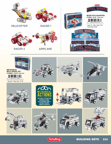 MICRO KITS ASSORTED. STWMK • $2.50 • 12 pc min HELICOPTER RACER 1 • Ages: 8+ • Pkg. Size: 5” W • 4 assorted styles RACER 2 AIRPLANE MECHANICAL MULTI-MODEL SET STWMMS • $15.00 • 6 pc min • Ages:8+ • Pkg. Size: 14” W BUILDING SETS 233