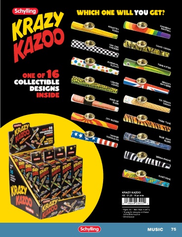 KRAZY KAZOO KK • $1.25 • 16 pc min • Ages: 3+ • Item Size: 6.25” L • 16 playful designs on these collectible kazoos • Blind boxed MUSIC 75