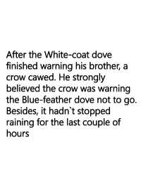After the White-coat dove finished warning his brother, a crow cawed. He strongly believed the crow was warning the Blue-feather dove not to go. Besides, it hadn`t stopped raining for the last couple of hours