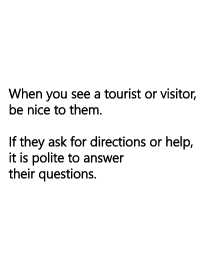 When you see a tourist or visitor, be nice to them. If they ask for directions or help, it is polite to answer their questions.