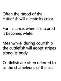 Often the mood of the cuttlefish will dictate its color. For instance, when it is scared it becomes white. Meanwhile, during courtship the cuttlefish will adopt stripes along its body. Cuttlefish are often referred to as the chameleons of the sea.