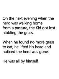 On the next evening when the herd was walking home from a pasture, the Kid got lost nibbling the grass. When he found no more grass to eat, he lifted his head and noticed the herd was gone. He was all by himself.
