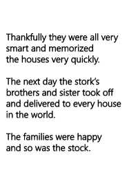 Thankfully they were all very smart and memorized the houses very quickly. The next day the stork’s brothers and sister took off and delivered to every house in the world. The families were happy and so was the stock.