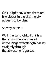 On a bright day when there are few clouds in the sky, the sky appears to be blue. So why is this? Well, the sun’s white light hits the atmosphere and most of the longer wavelength passes straightly through the atmospheric gasses.