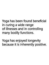 Yoga has been found beneficial in curing a wide range of illnesses and in controlling many bodily functions. Yoga has enjoyed longevity because it is inherently positive.