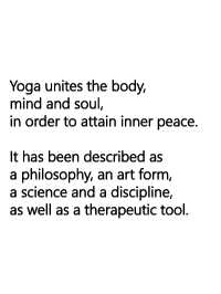 Yoga unites the body, mind and soul, in order to attain inner peace. It has been described as a philosophy, an art form, a science and a discipline, as well as a therapeutic tool.